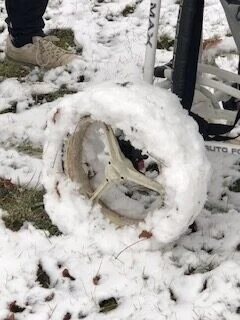 Besloten werd dan ook de toeter na drie holes te gebruiken, zodat we allemaal weer richting clubhuis konden. Maar goed ook want flightgenoot Huub was vergeten sneeuwkettingen om zijn wielen te leggen en zoals op de foto te zien is was dat geen overbodige luxe.